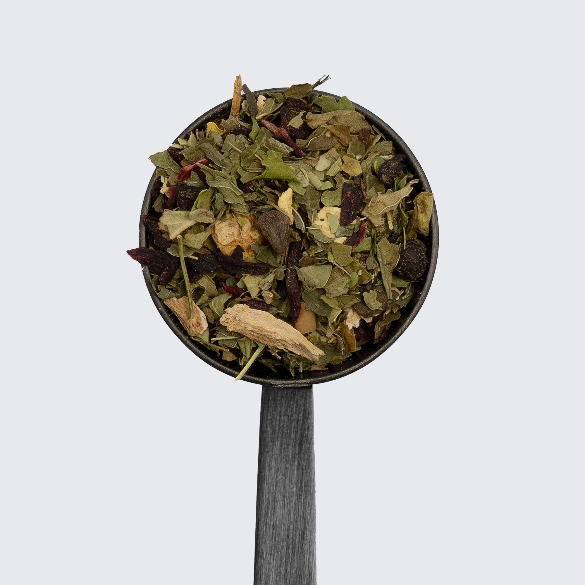 Spearmint, moringa, yerba mate, damiana, cinnamon, gotu kola, ashwagandha, lavender, hibiscus, juniper berries, ginger, slippery elm, tomato flakes, turmeric, black pepper, fenugreek.